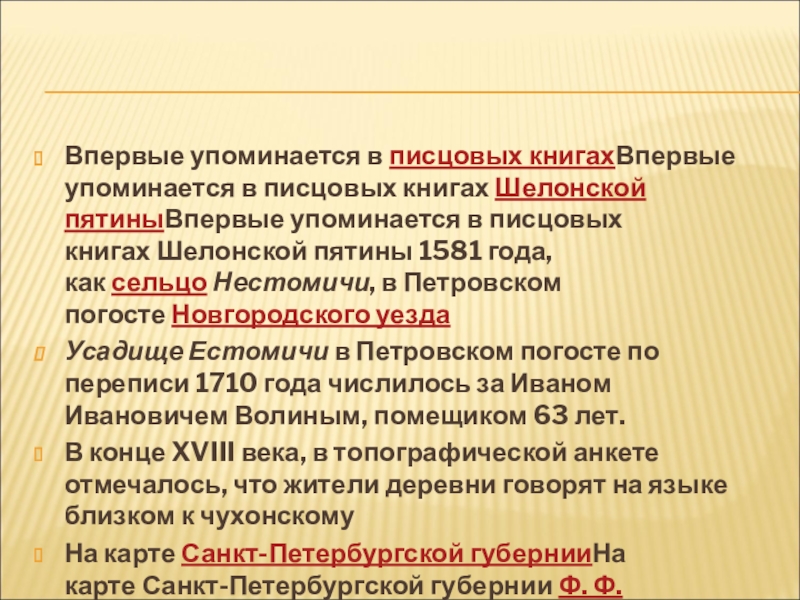 Впервые упоминается в писцовых книгахВпервые упоминается в писцовых книгах Шелонской пятиныВпервые упоминается в писцовых книгах Шелонской
