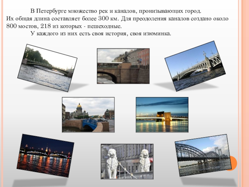 В Петербурге множество рек и каналов, пронизывающих город. Их общая длина составляет более 300 км. Для преодоления каналов создано около 800 мостов, 218 из которых - пешеходные.