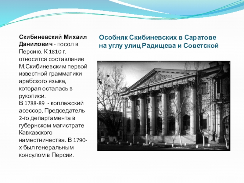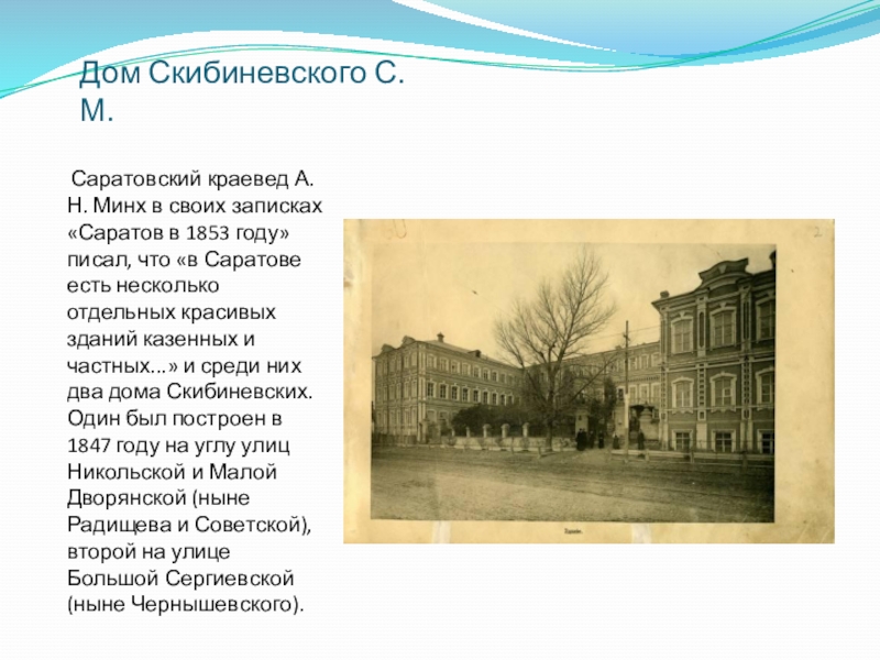 в 1853 году» писал, что «в Саратове есть несколько отдельных красивых зданий казенных и частных...» и среди них два дома Скибиневских. Один был построен в 1847 году на углу улиц Никольской и Малой Дворянской (ныне Радищева и Советской), второй на улице Большой Сергиевской (ныне Чернышевского).