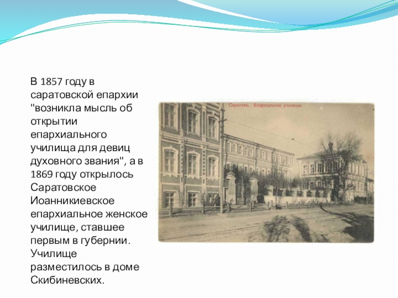 училища для девиц духовного звания", а в 1869 году открылось Саратовское Иоанникиевское епархиальное женское училище, ставшее первым в губернии. Училище разместилось в доме Скибиневских.