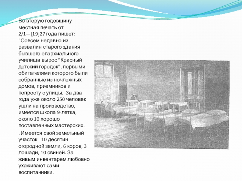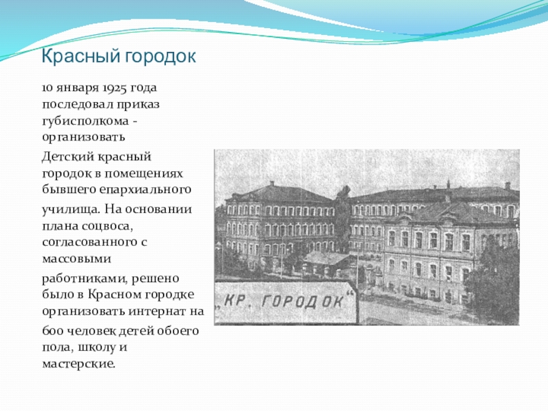 из развалин старого здания бывшего епархиального училища вырос "Красный детский городок", первыми обитателями которого были собранные из ночлежных домов, приемников и попросту с улицы. За два года уже около 250 человек ушли на производство, имеется школа 9-летка, около 10 хорошо поставленных мастерских.