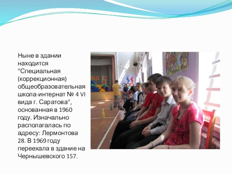 Слайд 15Ныне в здании находится "Специальная (коррекционная) общеобразовательная школа-интернат № 4 VI