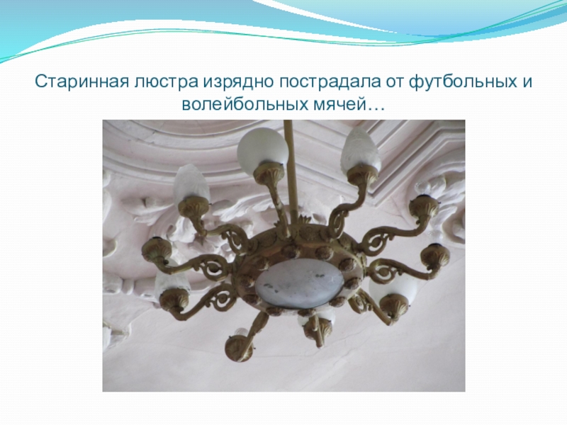 Слайд 19Старинная люстра изрядно пострадала от футбольных и волейбольных мячей…