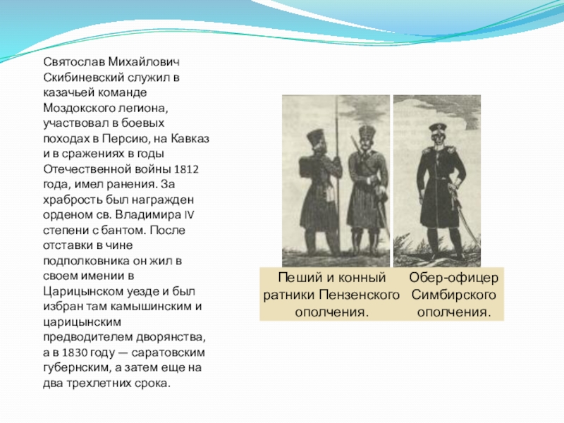 Слайд 4Святослав Михайлович Скибиневский служил в казачьей команде Моздокского легиона, участвовал в