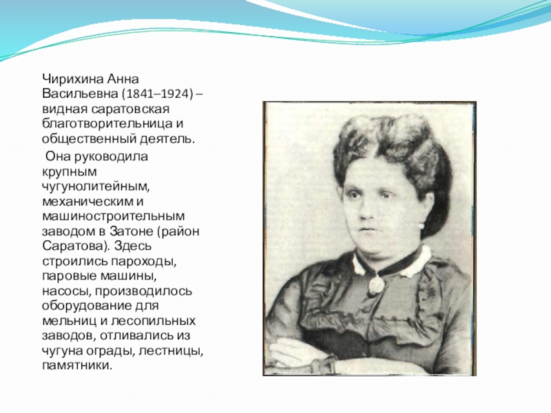 Чирихина Анна Васильевна (1841–1924) – видная саратовская благотворительница и общественный деятель.