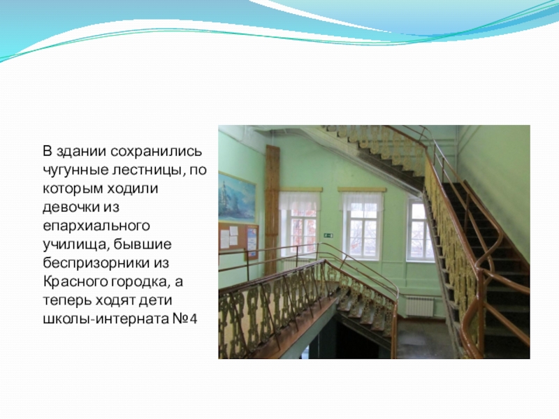 Слайд 16В здании сохранились чугунные лестницы, по которым ходили девочки из епархиального