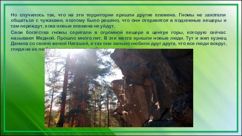 Свои богатства гномы спрятали в огромной пещере в центре горы, которую сейчас называют Медной. Прошло много лет. В эти места пришли новые люди. Тут и жил кузнец Данила со своею женой Наташей, и так они сильно любили друг друга, что все люди вокруг, глядя на их любовь становились добрее и лучше.