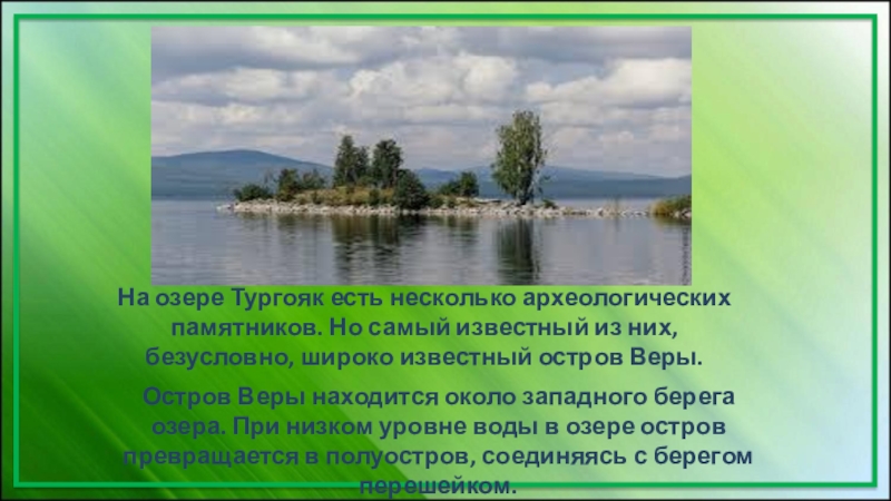 Слайд 19На озере Тургояк есть несколько археологических памятников. Но самый известный из