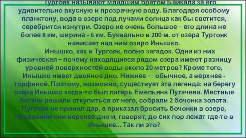 Слайд 18Тургояк называют младшим братом Байкала за его удивительно вкусную и прозрачную