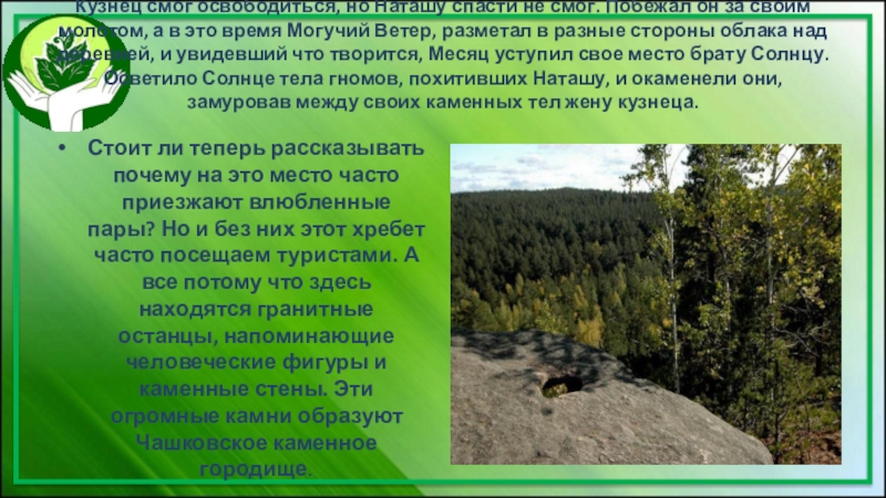 Стоит ли теперь рассказывать почему на это место часто приезжают влюбленные пары? Но и без них этот хребет часто посещаем туристами. А все потому что здесь находятся гранитные останцы, напоминающие человеческие фигуры и каменные стены. Эти огромные камни образуют Чашковское каменное городище.