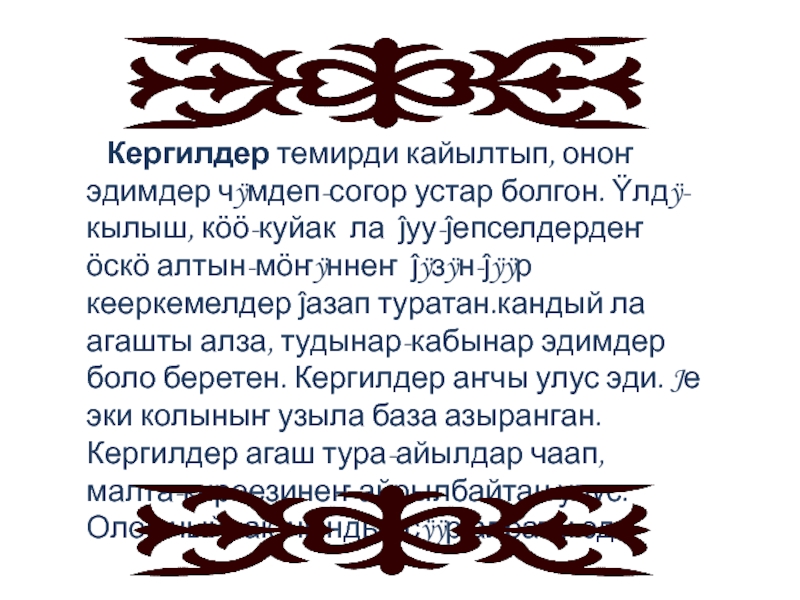 Слайд 6 Кергилдер темирди кайылтып, оноҥ эдимдер чÿмдеп-согор устар болгон. Ϋлдÿ-