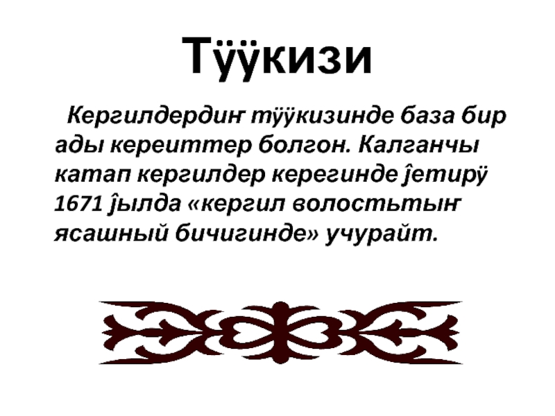 Тÿÿкизи     Кергилдердиҥ тÿÿкизинде база бир ады кереиттер болгон. Калганчы катап кергилдер керегинде