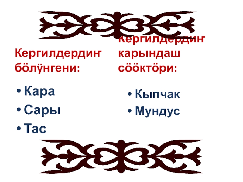 Кергилдердиҥ бӧлÿнгени: Кара Сары Тас Кергилдердиҥ карындаш сӧӧктӧри: Кыпчак Мундус