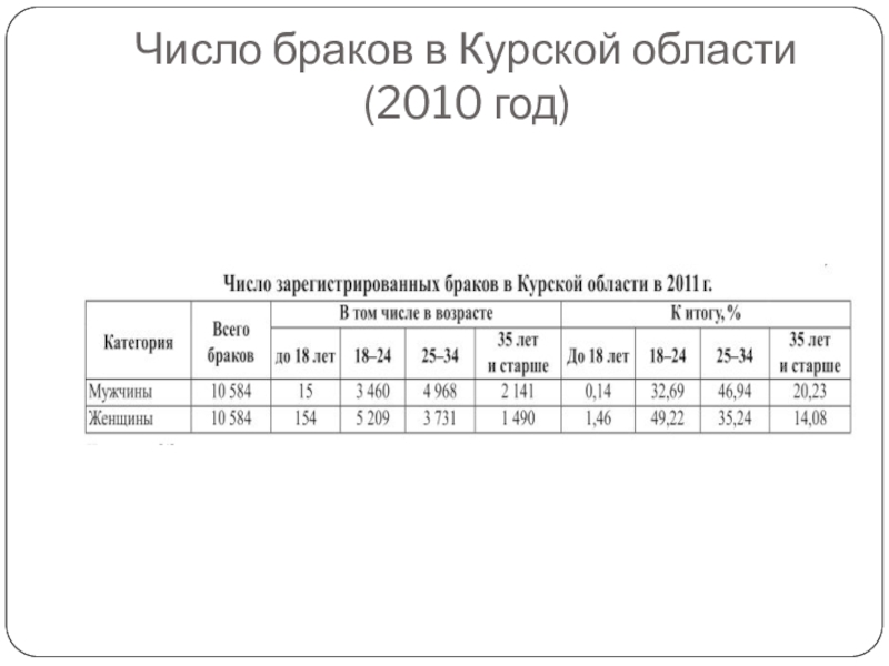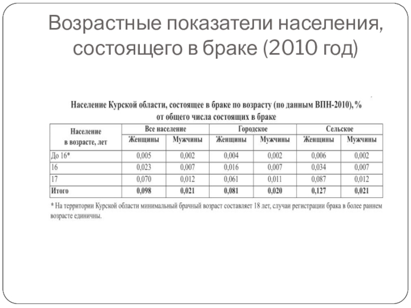 Слайд 6Возрастные показатели населения, состоящего в браке (2010 год)