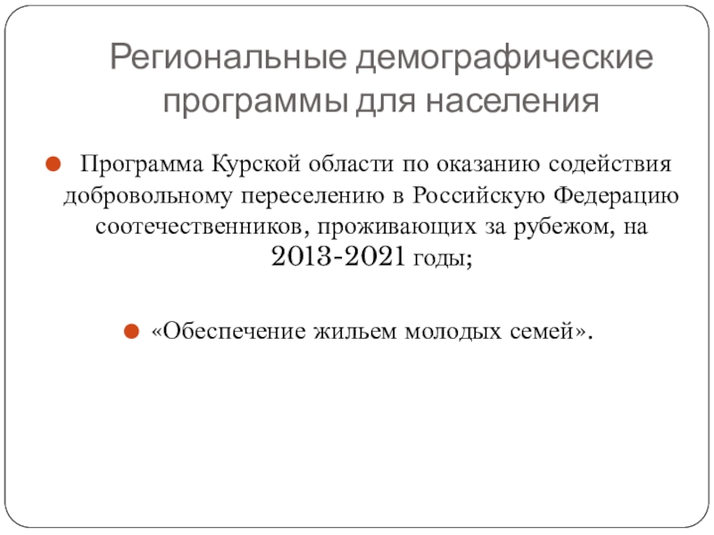 Региональные демографические программы для населения Программа Курской области по оказанию содействия добровольному переселению в Российскую Федерацию соотечественников, проживающих