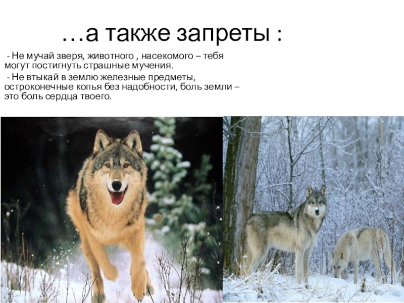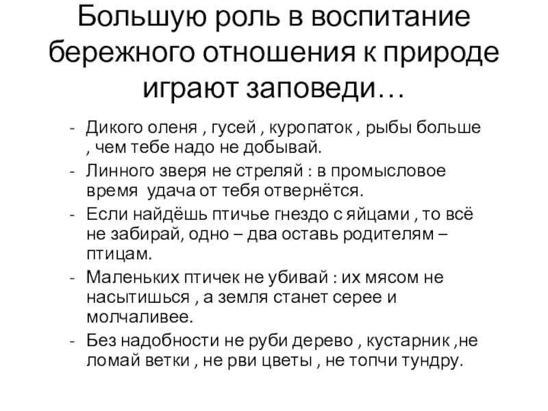 оленя , гусей , куропаток , рыбы больше , чем тебе надо не добывай.