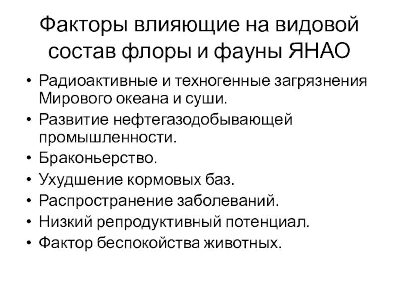 Слайд 18Факторы влияющие на видовой состав флоры и фауны ЯНАО