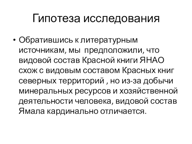 книги ЯНАО схож с видовым составом Красных книг северных территорий , но из-за добычи минеральных ресурсов и хозяйственной деятельности человека, видовой состав Ямала кардинально отличается.