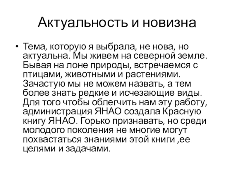 живем на северной земле. Бывая на лоне природы, встречаемся с птицами, животными и растениями. Зачастую мы не можем назвать, а тем более знать редкие и исчезающие виды. Для того чтобы облегчить нам эту работу, администрация ЯНАО создала Красную книгу ЯНАО. Горько признавать, но среди молодого поколения не многие могут похвастаться знаниями этой книги ,ее целями и задачами.