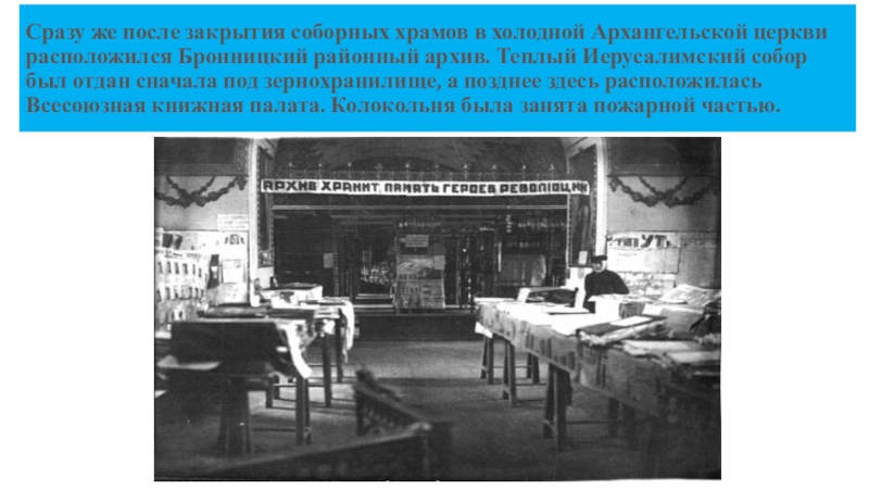 Слайд 12Сразу же после закрытия соборных храмов в холодной Архангельской церкви расположился