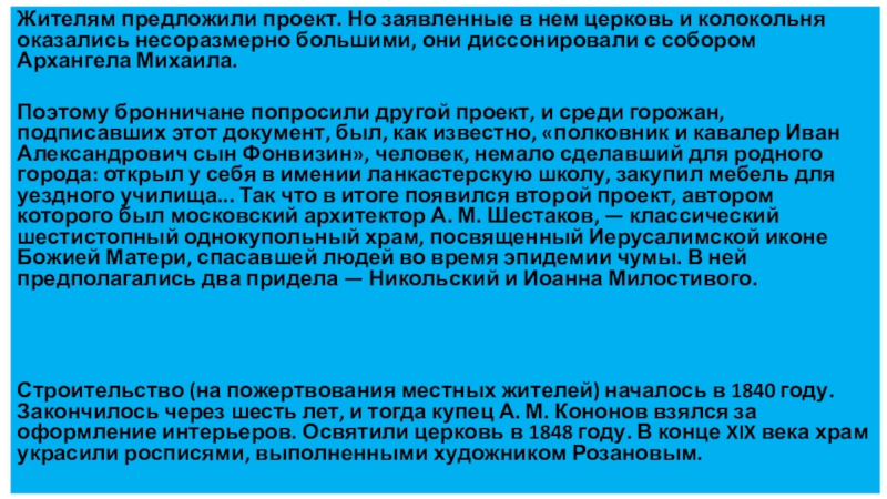 Поэтому бронничане попросили другой проект, и среди горожан, подписавших этот документ, был, как известно, «полковник и кавалер Иван Александрович сын Фонвизин», человек, немало сделавший для родного города: открыл у себя в имении ланкастерскую школу, закупил мебель для уездного училища... Так что в итоге появился второй проект, автором которого был московский архитектор А. М. Шестаков, — классический шестистопный однокупольный храм, посвященный Иерусалимской иконе Божией Матери, спасавшей людей во время эпидемии чумы. В ней предполагались два придела — Никольский и Иоанна Милостивого.