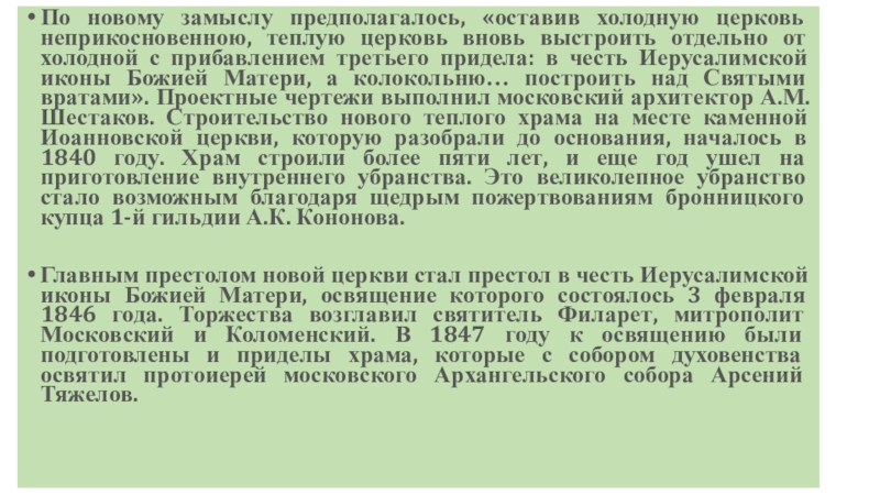 выстроить отдельно от холодной с прибавлением третьего придела: в честь Иерусалимской иконы Божией Матери, а колокольню… построить над Святыми вратами». Проектные чертежи выполнил московский архитектор А.М. Шестаков. Строительство нового теплого храма на месте каменной Иоанновской церкви, которую разобрали до основания, началось в 1840 году. Храм строили более пяти лет, и еще год ушел на приготовление внутреннего убранства. Это великолепное убранство стало возможным благодаря щедрым пожертвованиям бронницкого купца 1-й гильдии А.К. Кононова.