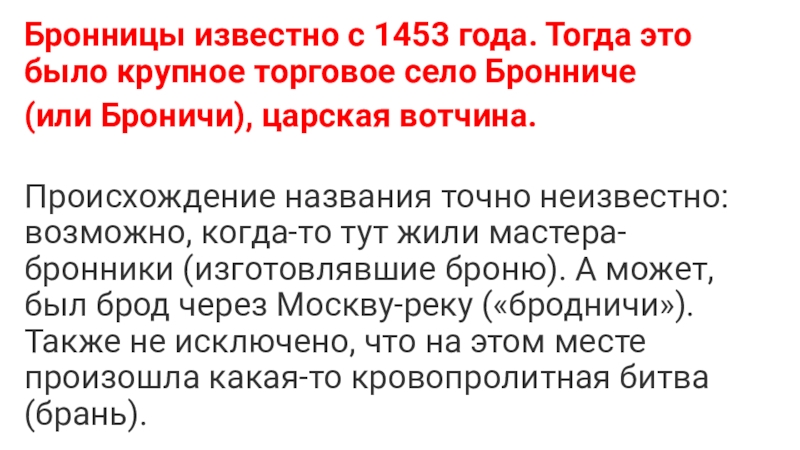 Слайд 2Бронницы известно с 1453 года. Тогда это было крупное торговое село