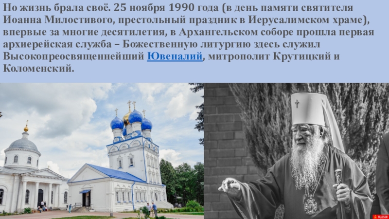 святителя Иоанна Милостивого, престольный праздник в Иерусалимском храме), впервые за многие десятилетия, в Архангельском соборе прошла первая архиерейская служба – Божественную литургию здесь служил Высокопреосвященнейший Ювеналий, митрополит Крутицкий и Коломенский.