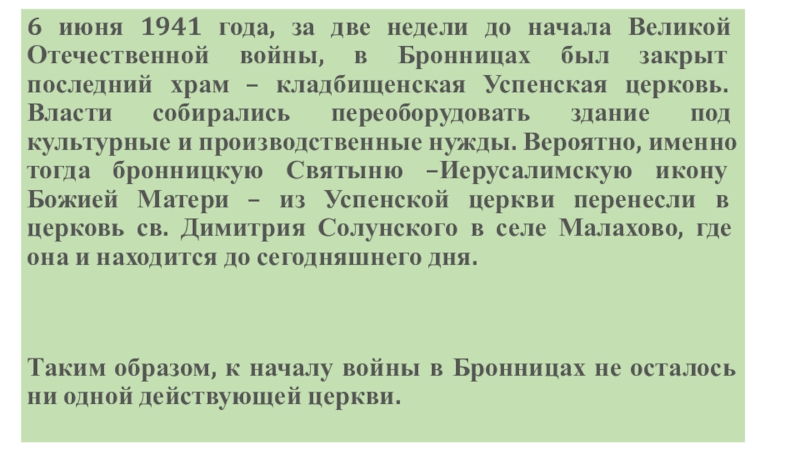 войны, в Бронницах был закрыт последний храм – кладбищенская Успенская церковь. Власти собирались переоборудовать здание под культурные и производственные нужды. Вероятно, именно тогда бронницкую Святыню –Иерусалимскую икону Божией Матери – из Успенской церкви перенесли в церковь св. Димитрия Солунского в селе Малахово, где она и находится до сегодняшнего дня.