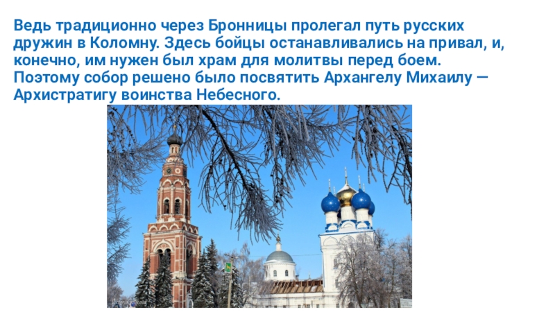 Слайд 4Ведь традиционно через Бронницы пролегал путь русских дружин в Коломну. Здесь