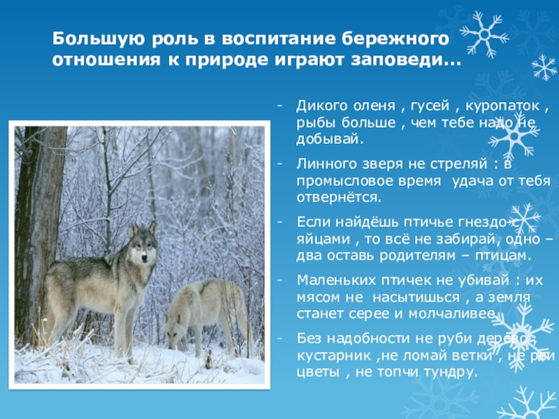 Большую роль в воспитание бережного отношения к природе играют заповеди…