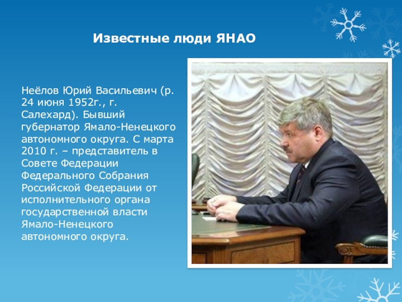Салехард). Бывший губернатор Ямало-Ненецкого автономного округа. С марта 2010 г. – представитель в Совете Федерации Федерального Собрания Российской Федерации от исполнительного органа государственной власти Ямало-Ненецкого автономного округа.