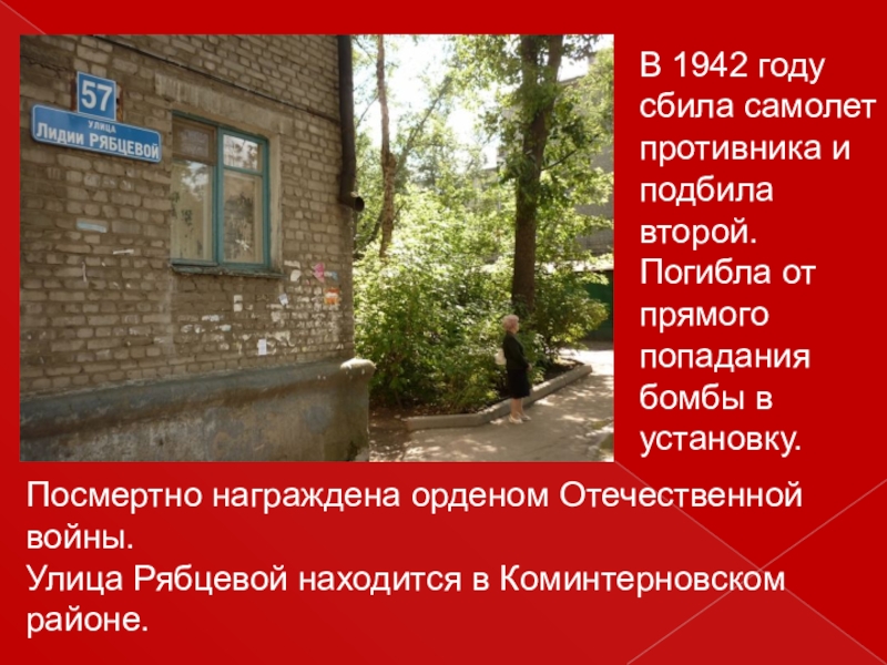 Слайд 25В 1942 году сбила самолет противника и подбила второй. Погибла от