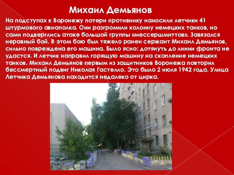 Они разгромили колонну немецких танков, но сами подверглись атаке большой группы «мессершмиттов». Завязался неравный бой. В этом бою был тяжело ранен сержант Михаил Демьянов, сильно повреждена его машина. Было ясно: дотянуть до линии фронта не удастся. И летчик направил горящую машину на скопление немецких танков. Михаил Демьянов первым из защитников Воронежа повторил бессмертный подвиг Николая Гастелло. Это было 2 июля 1942 года. Улица Летчика Демьянова находится недалеко от цирка.