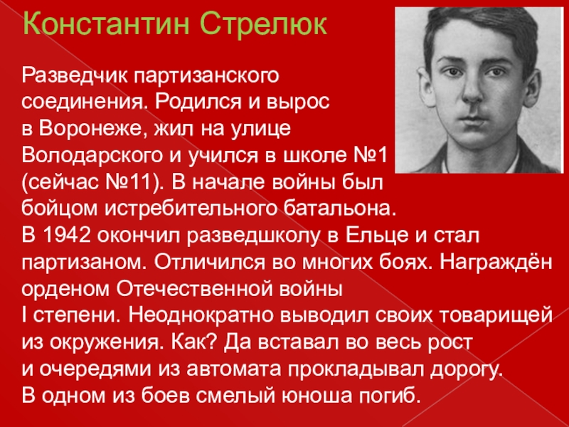 №11, где учился Константин, взяли одинокую женщину под свою опеку. Она передала им документы и фотографии сына. Так родилась идея названия улицы. Именно школа настояла на том, чтобы улице присвоили имя Кости Стрелюка. Улица пролегает в Центральном районе между улицами Плехановской (Д. К.) и Чернышевского (К.).