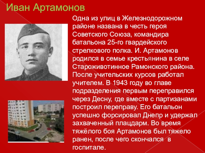 героя Советского Союза, командира батальона 25-го гвардейского стрелкового полка. И. Артамонов родился в семье крестьянина в селе Староживотинное Рамонского района. После учительских курсов работал учителем. В 1943 году во главе подразделения первым переправился через Десну, где вместе с партизанами построил переправу. Его батальон успешно форсировал Днепр и удержал захваченный плацдарм. Во время тяжёлого боя Артамонов был тяжело ранен, после чего скончался в госпитале.