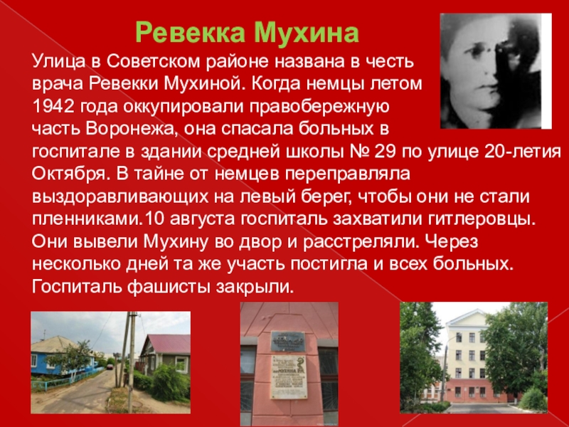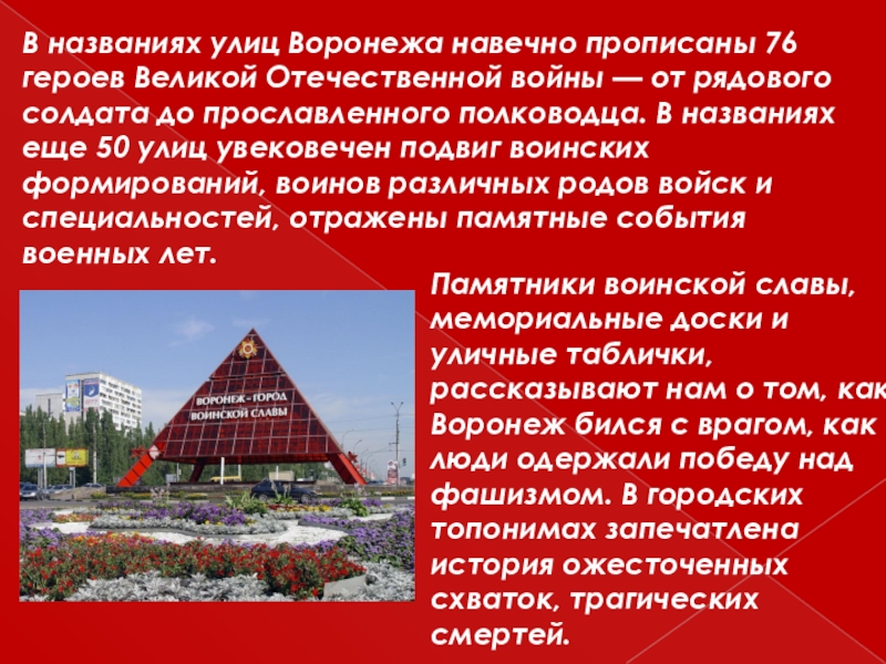 том, как Воронеж бился с врагом, как люди одержали победу над фашизмом. В городских топонимах запечатлена история ожесточенных схваток, трагических смертей.