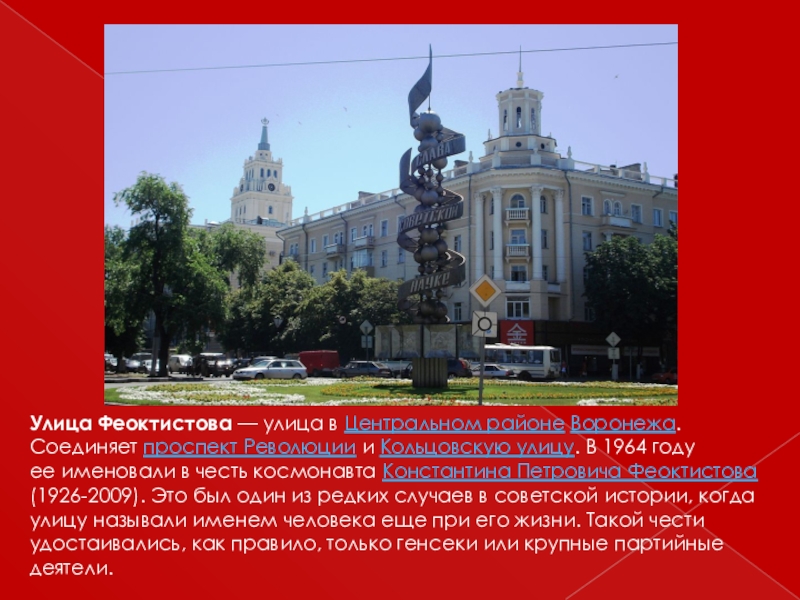 Слайд 30Улица Феоктистова — улица в Центральном районе Воронежа. Соединяет проспект Революции и