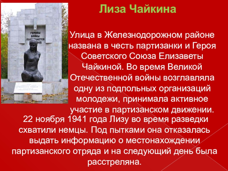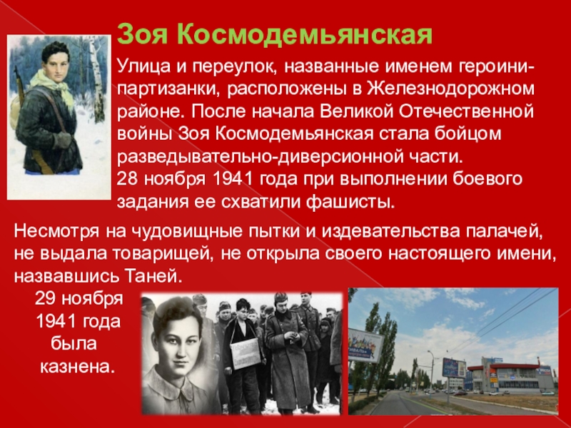 Улица и переулок, названные именем героини-партизанки, расположены в Железнодорожном районе.