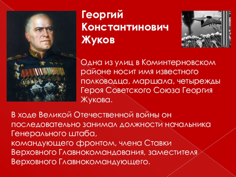 Слайд 12Одна из улиц в Коминтерновском районе носит имя известного полководца, маршала,