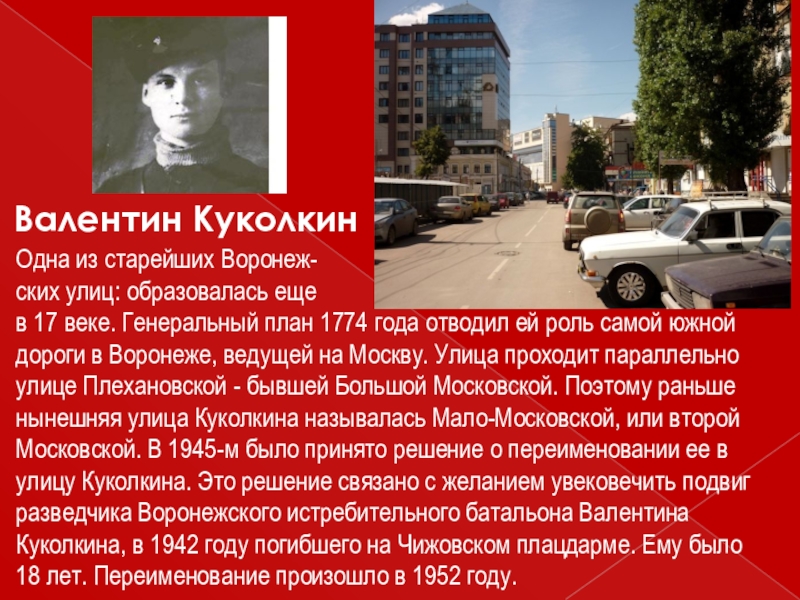 план 1774 года отводил ей роль самой южной дороги в Воронеже, ведущей на Москву. Улица проходит параллельно улице Плехановской - бывшей Большой Московской. Поэтому раньше нынешняя улица Куколкина называлась Мало-Московской, или второй Московской. В 1945-м было принято решение о переименовании ее в улицу Куколкина. Это решение связано с желанием увековечить подвиг разведчика Воронежского истребительного батальона Валентина Куколкина, в 1942 году погибшего на Чижовском плацдарме. Ему было