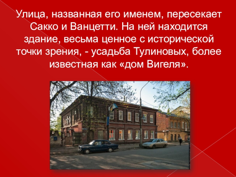 Слайд 8Улица, названная его именем, пересекает Сакко и Ванцетти. На ней находится