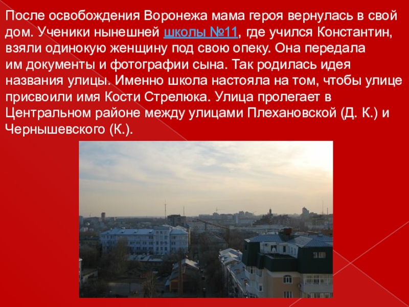 Слайд 28После освобождения Воронежа мама героя вернулась в свой дом. Ученики нынешней школы