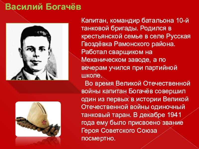 Капитан, командир батальона 10-й танковой бригады. Родился в крестьянской семье