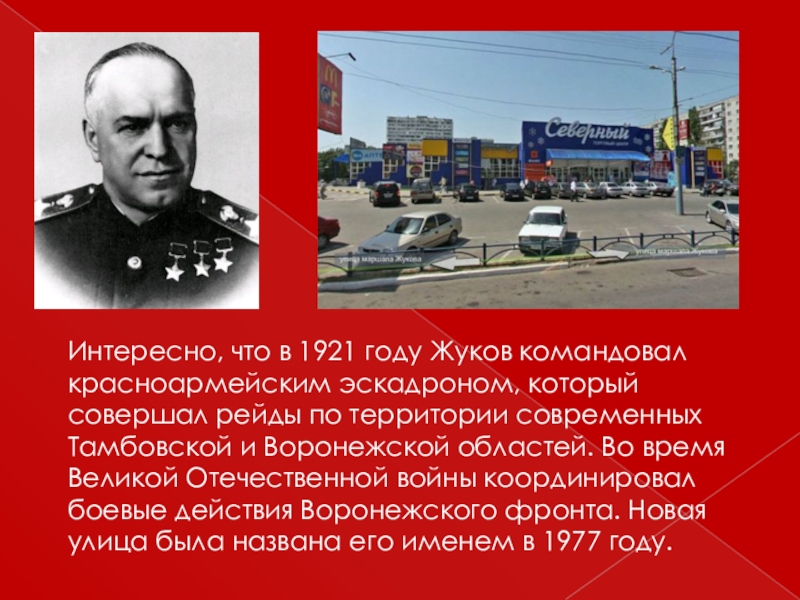 рейды по территории современных Тамбовской и Воронежской областей. Во время Великой Отечественной войны координировал боевые действия Воронежского фронта. Новая улица была названа его именем в 1977 году.