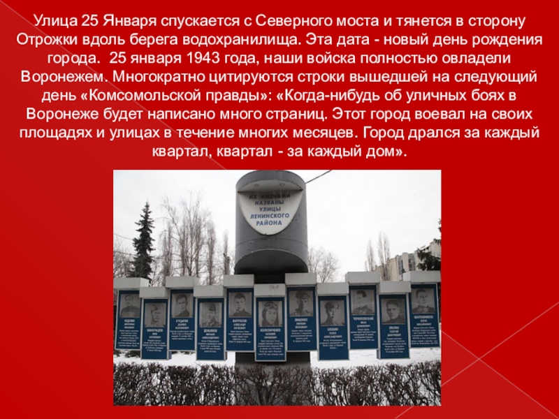 Слайд 37Улица 25 Января спускается с Северного моста и тянется в сторону