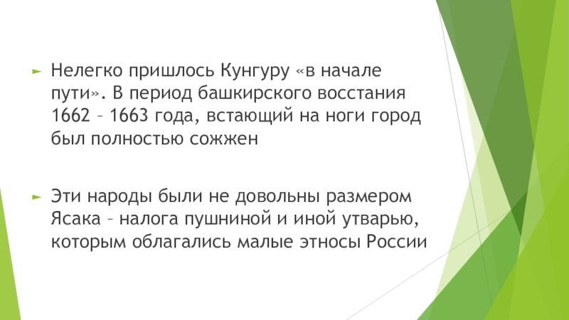 Слайд 3Нелегко пришлось Кунгуру «в начале пути». В период башкирского восстания 1662