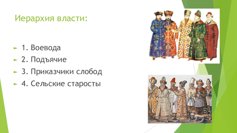 подъячие – приказные служители, отличавшиеся «своеобразным» нравом (именно тогда возникла пословица «Подъячий любит принос горячий»). В их подчинений находились приказчики слобод и сельские старосты