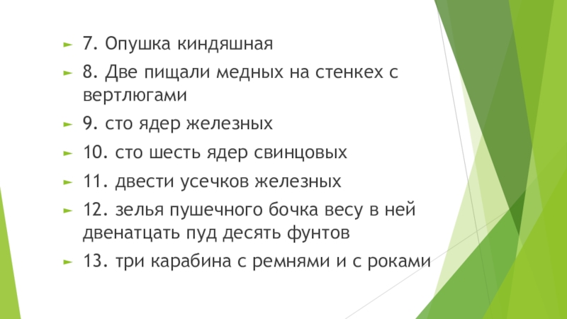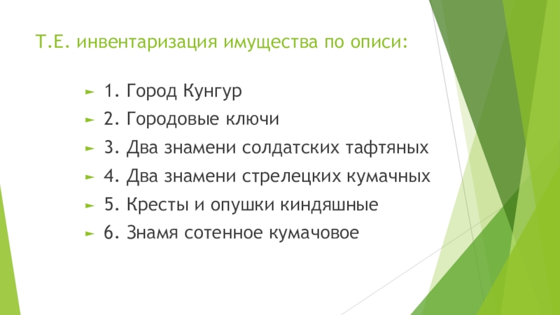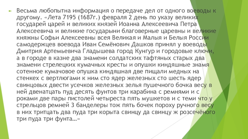 «Лета 7195 (1687г.) февраля 2 день по указу великих государей царей и великих князей Иоанна Алексеевича Петра Алексеевича и великие государыни благоверные царевны и великие княжны Софьи Алексеевны всея Великая и Малыя и Белыя России самодержцев воевода Иван Семёнович Дашков принял у воеводы Дмитрия Артемьевича Гладышева город Кунгур и городовые ключи, а в городе в казне два знамени солдатских тафтяных старых два знамени стрелецких кумачных кресты и опушки киндяшные знамя сотенное кумачовое опушка киндяшная две пищали медных на стенкех с вертлюгами к ним сто ядер железных сто шесть ядер свинцовых двести усечков железных зелья пушечного бочка весу в ней двенатцать пуд десять фунтов три карабина с ремнями и с роками две пары пистолей четыреста пять мушкетов и с теми что у стрельцов ремней 3 банделеры тож пять бочек пороху ручного весу в них тритцать два пуда три корыта свинцу да свинцу ж розсечёного три пуда три фунта…»