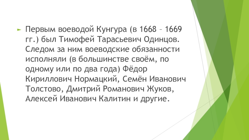 Слайд 17Первым воеводой Кунгура (в 1668 – 1669 гг.) был Тимофей Тарасьевич